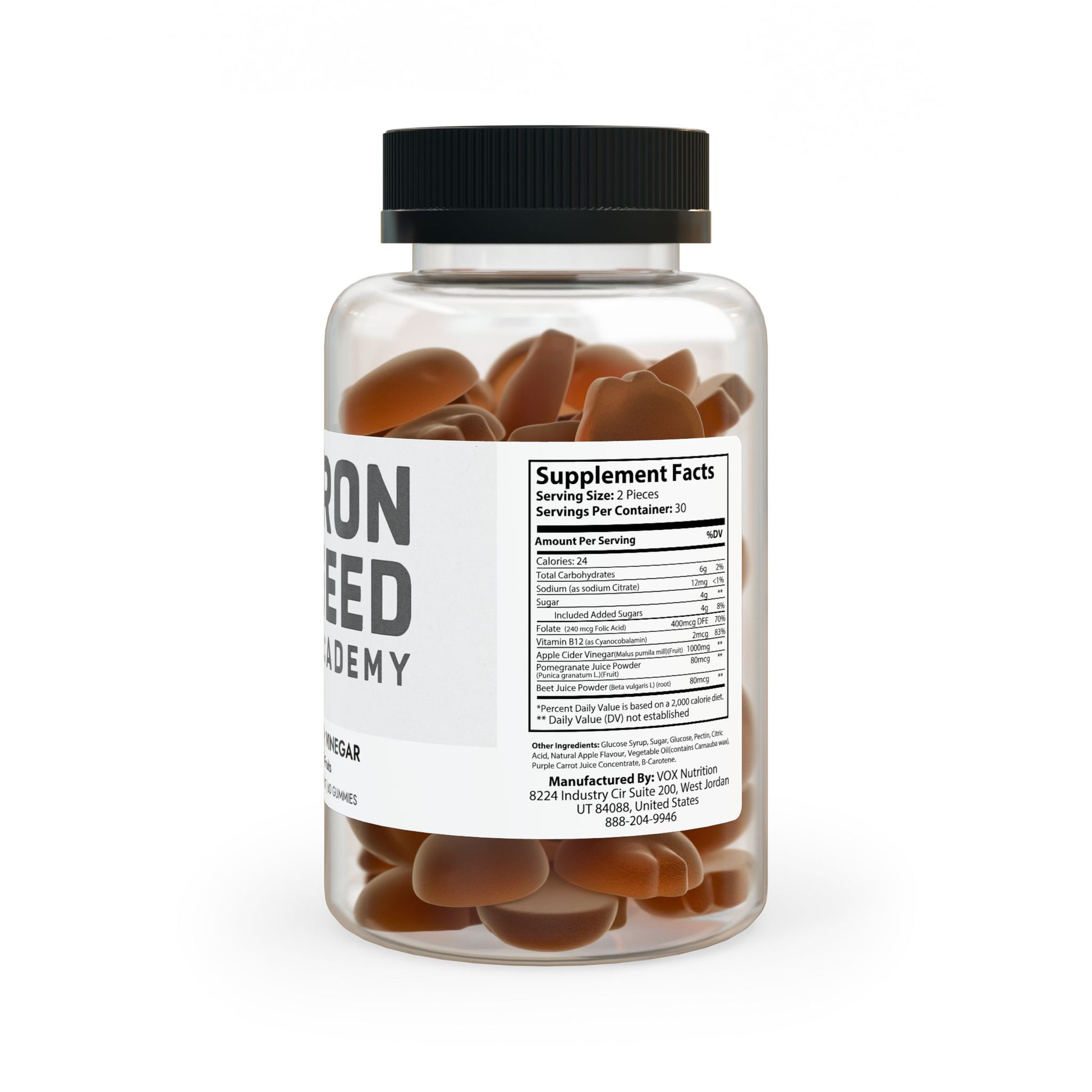 Ingredients: Sodium (as sodium Citrate), Sugar, Folate (240 mcg Folic Acid), Vitamin B12 (as Cyanocobalamin), Apple Cider Vinegar(Malus pumila mill)(Fruit), Pomegranate Juice Powder (Punica granatum L.)(Fruit), Beet Juice Powder (Beta vulgaris L) (root). Other Ingredients: Glucose Syrup, Sugar, Glucose,Pectin, Citric Acid, Natural Apple Flavour, Vegetable Oil(contains Carnauba wax), Purple Carrot Juice Concentrate, B-Carotene.